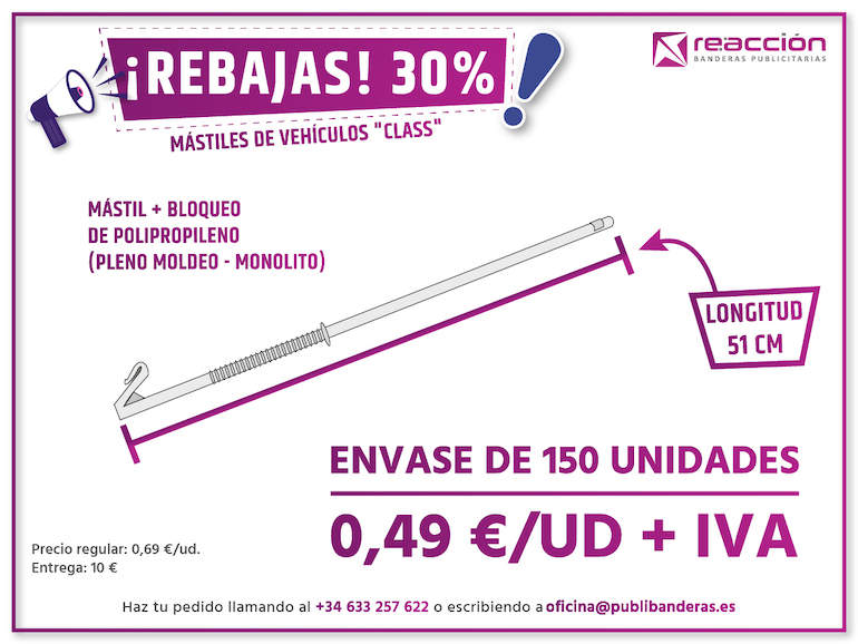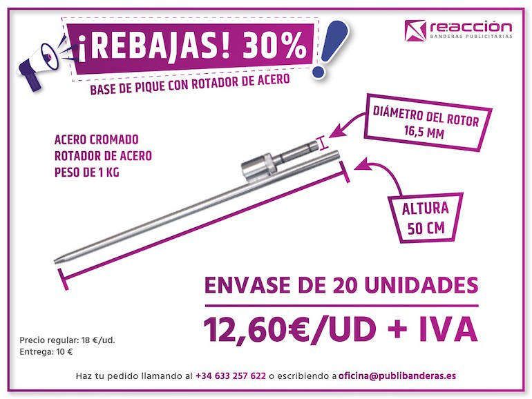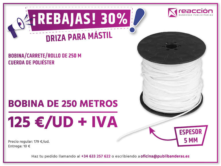 Rebajas Base de pique con rotador de acero Acero cromado rotador de acero peso de 1 kg - 12.60 Euro / ud. + IVA Driza para mástil Bobina / carrete / rollo de 250 m, cuerda de poliéster - 125 Euro / ud. + IVA Mástiles de vehículos "Class" Mástil + bloqueo de polipropileno (pleno moldeo - monolito) - 0,49 Euro / ud. + IVA Tumbona estándar Pide 100 tumbonas personalizadas con descuento y con entrega gratuita en España - 39 Euro / ud. + IVA